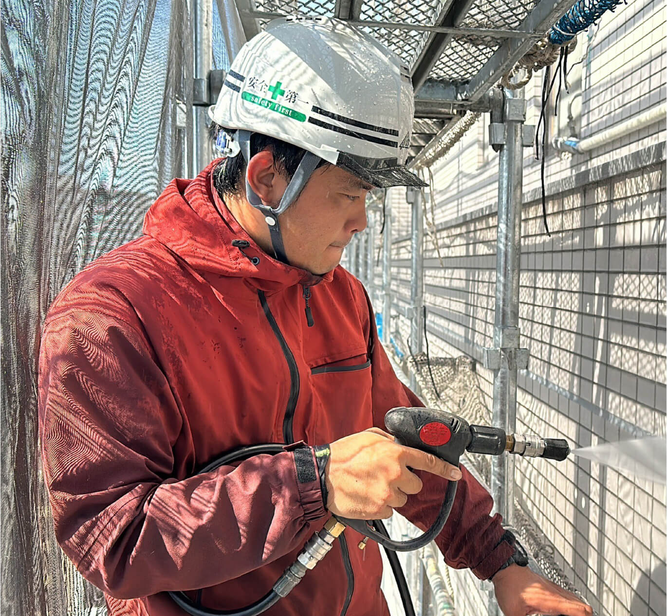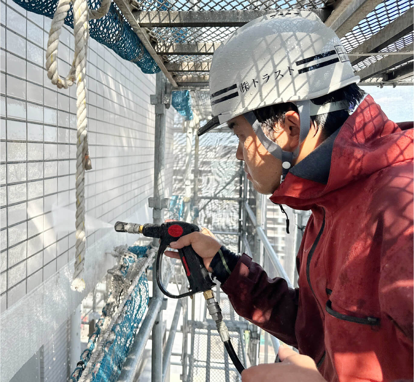 専用の機械を使い、建物の外壁にこびりついた汚れを水圧で綺麗に落としていく仕事です。